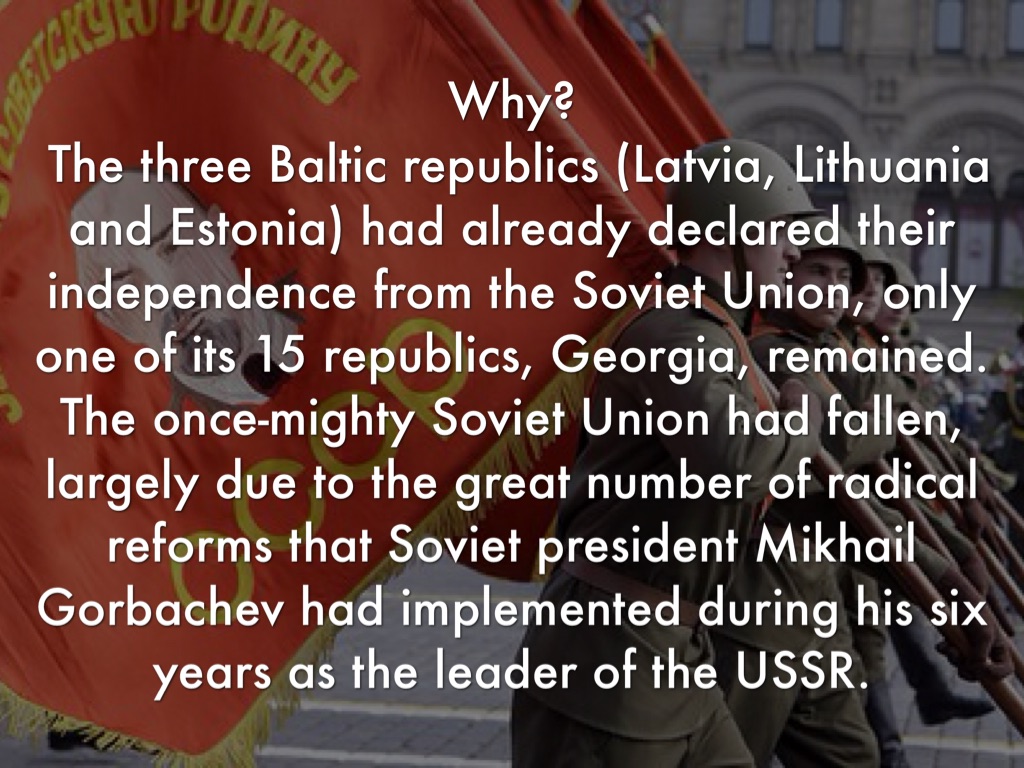 The three Baltic republics (Latvia, Lithuania and Estonia) had already declared their independence from the Soviet Union, only one of its 15 republics, Georgia, remained. The once-mighty Soviet Union had fallen, largely due to the great number of radical reforms that Soviet president Mikhail Gorbachev had implemented during his six years as the leader of the USSR.
