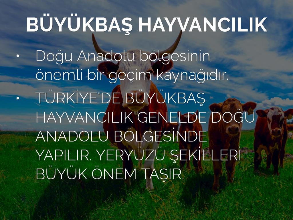 • TÜRKİYE’DE BÜYÜKBAŞ HAYVANCILIK GENELDE DOĞU ANADOLU BÖLGESİNDE YAPILIR. YERYÜZÜ ŞEKİLLERİ BÜYÜK ÖNEM TAŞIR.