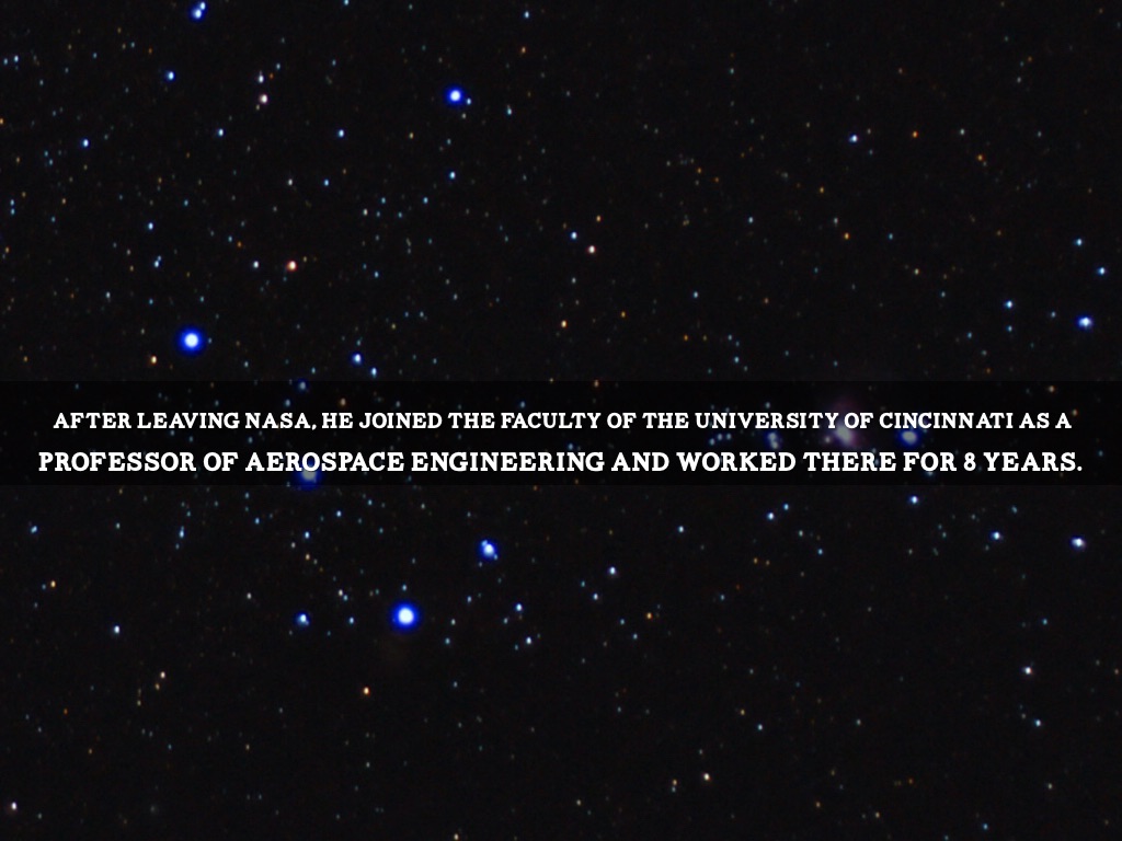 After leaving NASA, he joined the faculty of the University of Cincinnati as a