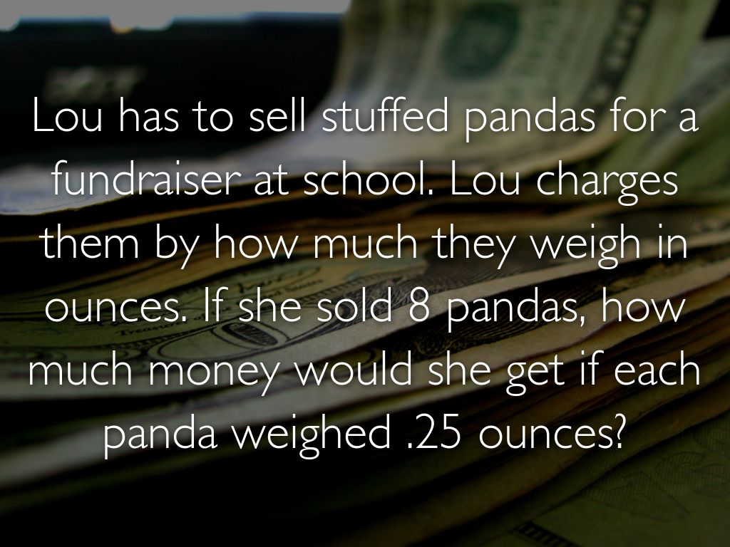 Lou has to sell stuffed pandas for a fundraiser at school. Lou charges them by how much they weigh in ounces. If she sold 8 pandas, how much money would she get if each panda weighed .25 ounces?