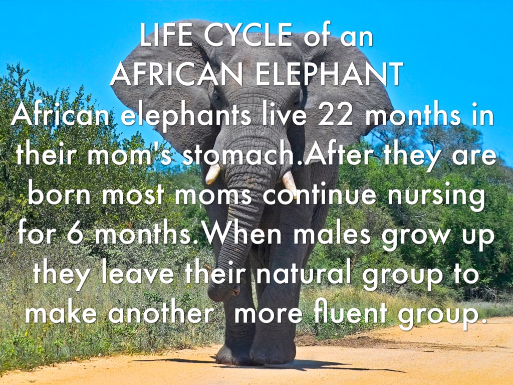 LIFE CYCLE of an AFRICAN ELEPHANT African elephants live 22 months in their mom's stomach.After they are born most moms continue nursing for 6 months.When males grow up they leave their natural group to make another more fluent group.