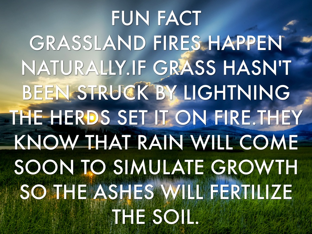 FUN FACT GRASSLAND FIRES HAPPEN NATURALLY.IF GRASS HASN'T BEEN STRUCK BY LIGHTNING THE HERDS SET IT ON FIRE.THEY KNOW THAT RAIN WILL COME SOON TO SIMULATE GROWTH SO THE ASHES WILL FERTILIZE THE SOIL.