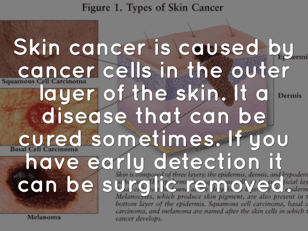 Skin cancer is caused by cancer cells in the outer layer of the skin. It a disease that can be cured sometimes. If you have early detection it can be surglic removed.