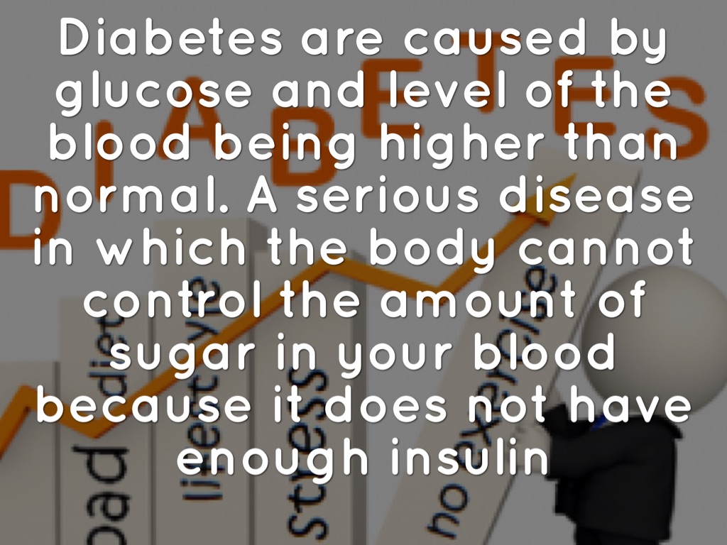 Diabetes are caused by glucose and level of the blood being higher than normal. A serious disease in which the body cannot control the amount of sugar in your blood because it does not have enough insulin