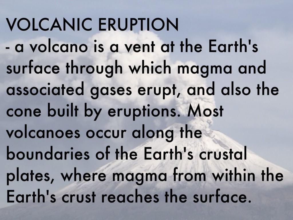 - a volcano is a vent at the Earth's surface through which magma and associated gases erupt, and also the cone built by eruptions. Most volcanoes occur along the boundaries of the Earth's crustal plates, where magma from within the Earth's crust reaches the surface.