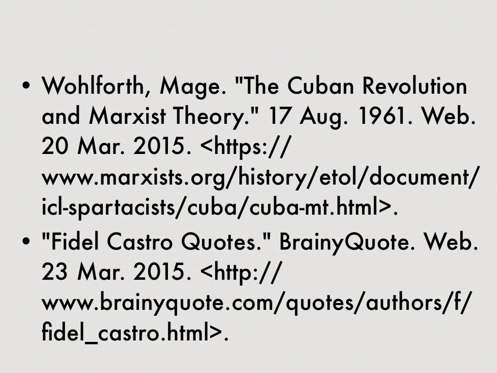 • Wohlforth, Mage. "The Cuban Revolution and Marxist Theory." 17 Aug. 1961. Web. 20 Mar. 2015. .