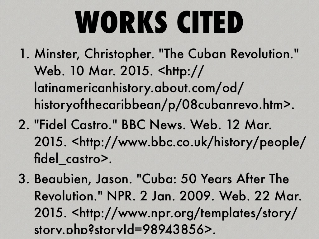 • Beaubien, Jason. "Cuba: 50 Years After The Revolution." NPR. 2 Jan. 2009. Web. 22 Mar. 2015. .