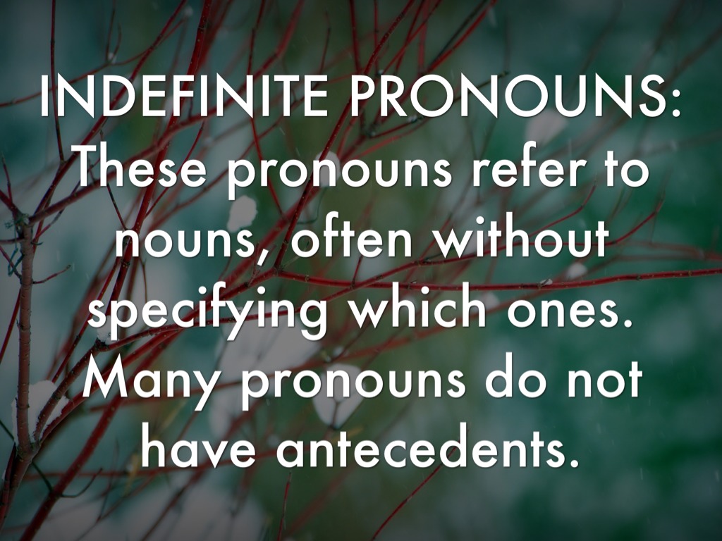 These pronouns refer to nouns, often without specifying which ones. Many pronouns do not have antecedents.