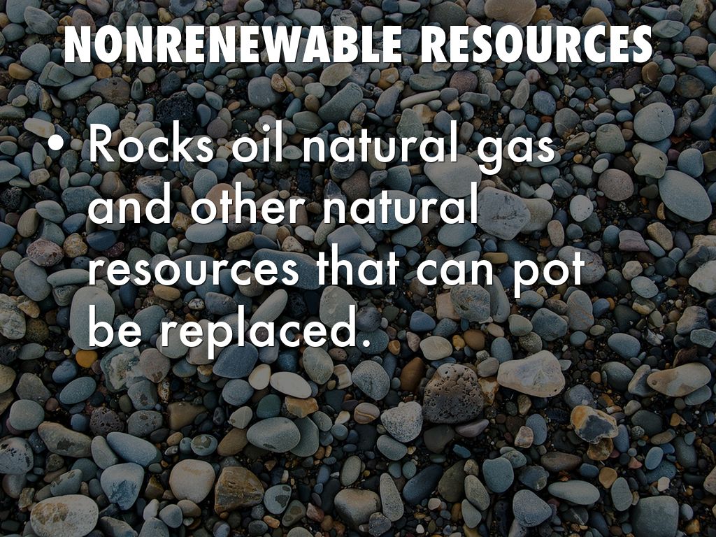 Rocks oil natural gas and other natural resources that can pot be replaced.