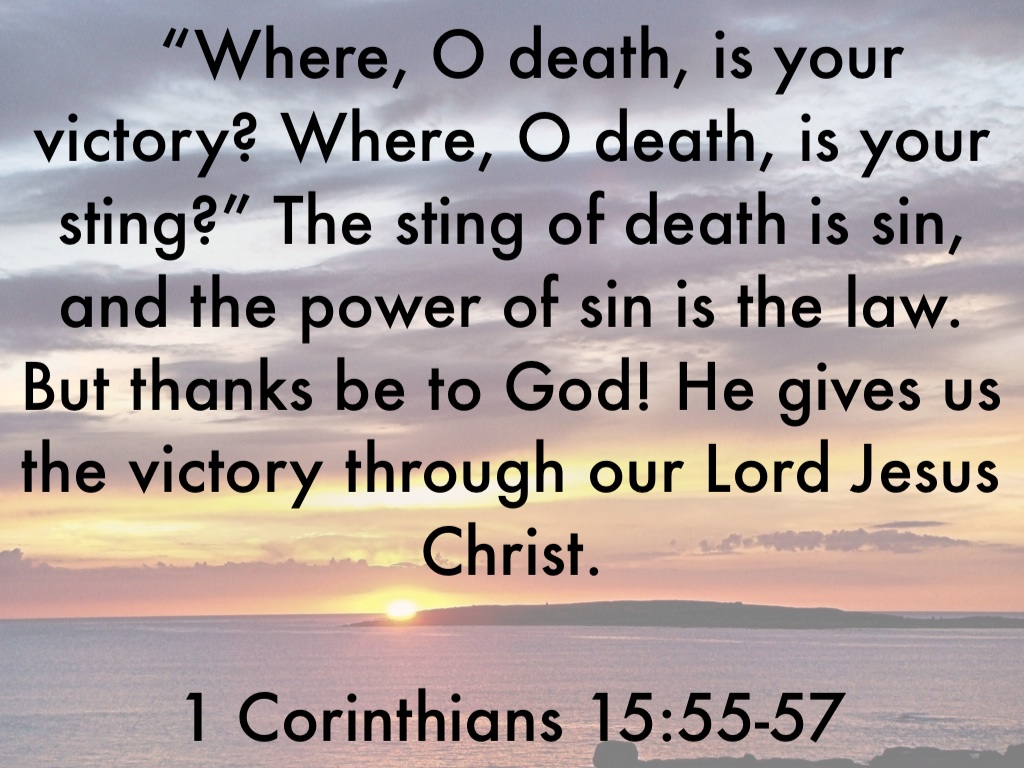“Where, O death, is your victory? Where, O death, is your sting?” The sting of death is sin, and the power of sin is the law. But thanks be to God! He gives us the victory through our Lord Jesus Christ.