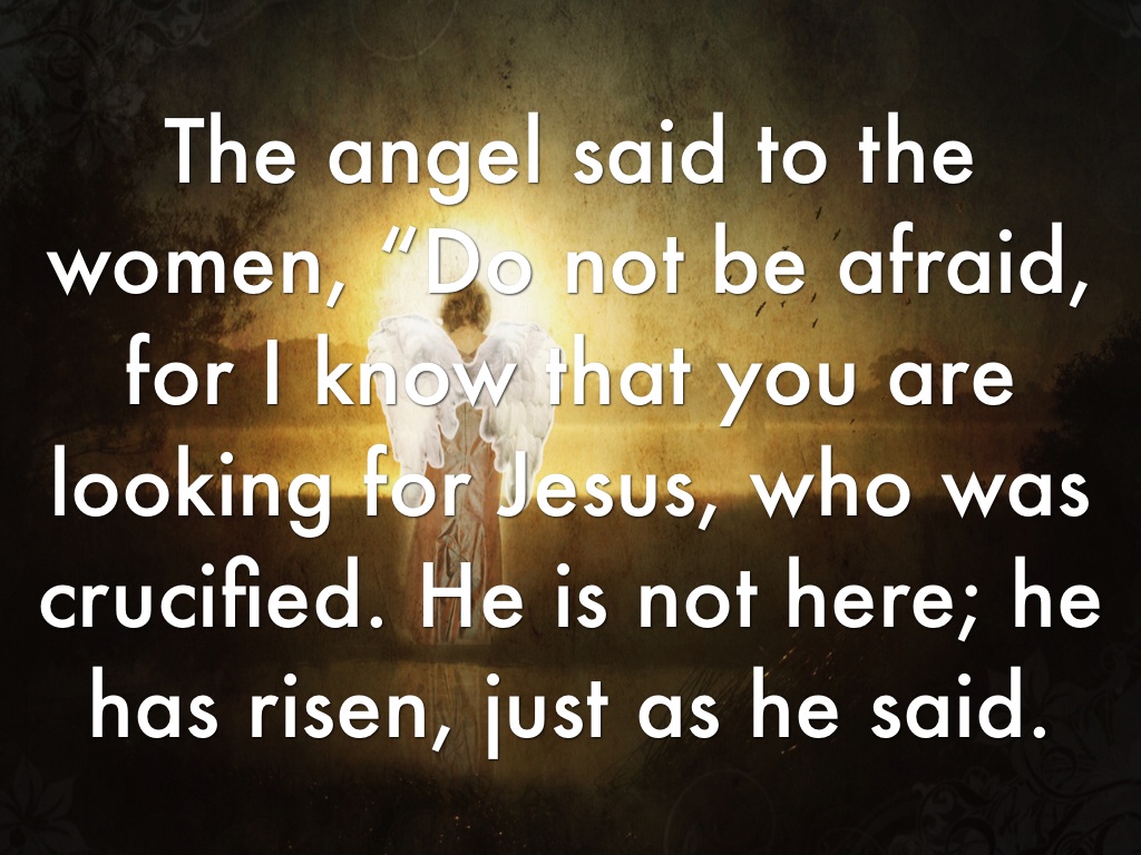 The angel said to the women, “Do not be afraid, for I know that you are looking for Jesus, who was crucified. He is not here; he has risen, just as he said.