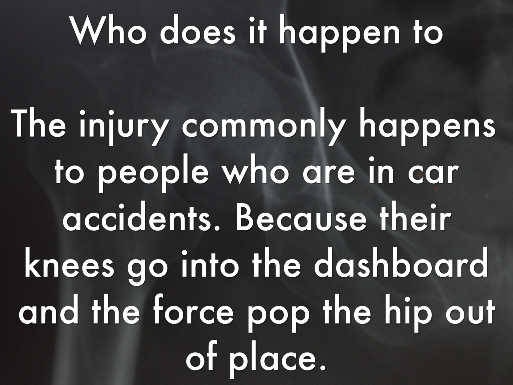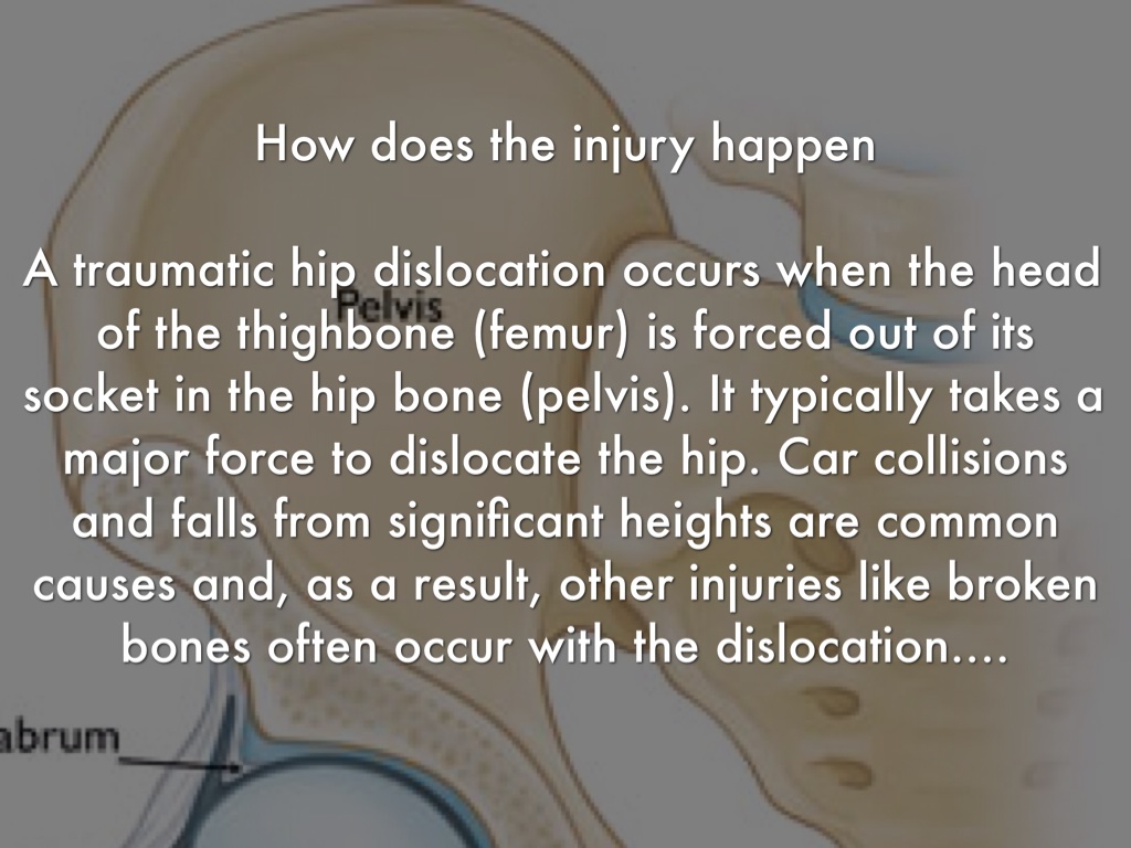 A traumatic hip dislocation occurs when the head of the thighbone (femur) is forced out of its socket in the hip bone (pelvis). It typically takes a major force to dislocate the hip. Car collisions and falls from significant heights are common causes and, as a result, other injuries like broken bones often occur with the dislocation.