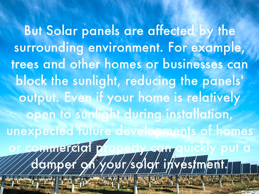 But Solar panels are affected by the surrounding environment. For example, trees and other homes or businesses can block the sunlight, reducing the panels' output. Even if your home is relatively open to sunlight during installation, unexpected future developments of homes or commercial property can quickly put a damper on your solar investment.