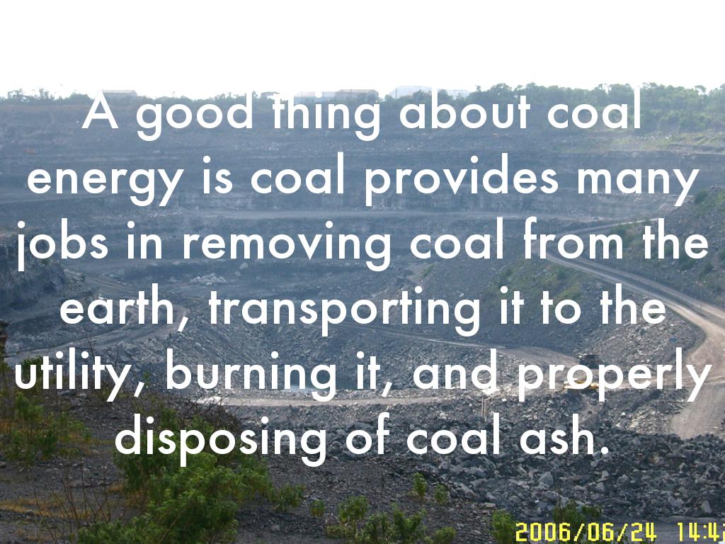 A good thing about coal energy is coal provides many jobs in removing coal from the earth, transporting it to the utility, burning it, and properly disposing of coal ash.