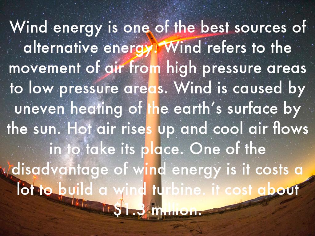 Wind energy is one of the best sources of alternative energy. Wind refers to the movement of air from high pressure areas to low pressure areas. Wind is caused by uneven heating of the earth’s surface by the sun. Hot air rises up and cool air flows in to take its place. One of the disadvantage of wind energy is it costs a lot to build a wind turbine. it cost about $1.3 million.