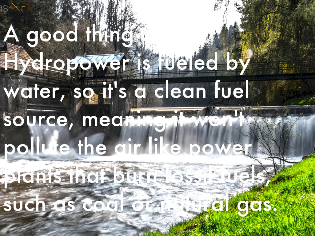 A good thing about Hydropower is fueled by water, so it's a clean fuel source, meaning it won't pollute the air like power plants that burn fossil fuels, such as coal or natural gas.