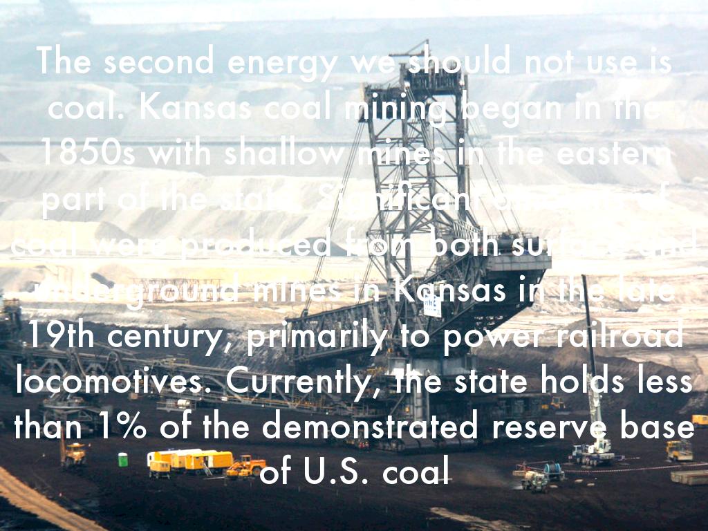 The second energy we should not use is coal. Kansas coal mining began in the 1850s with shallow mines in the eastern part of the state. Significant amounts of coal were produced from both surface and underground mines in Kansas in the late 19th century, primarily to power railroad locomotives. Currently, the state holds less than 1% of the demonstrated reserve base of U.S. coal