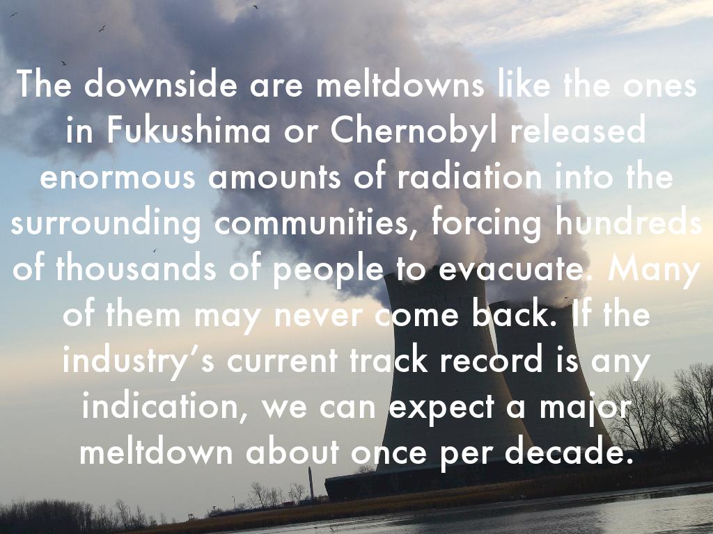 The downside are meltdowns like the ones in Fukushima or Chernobyl released enormous amounts of radiation into the surrounding communities, forcing hundreds of thousands of people to evacuate. Many of them may never come back. If the industry’s current track record is any indication, we can expect a major meltdown about once per decade.