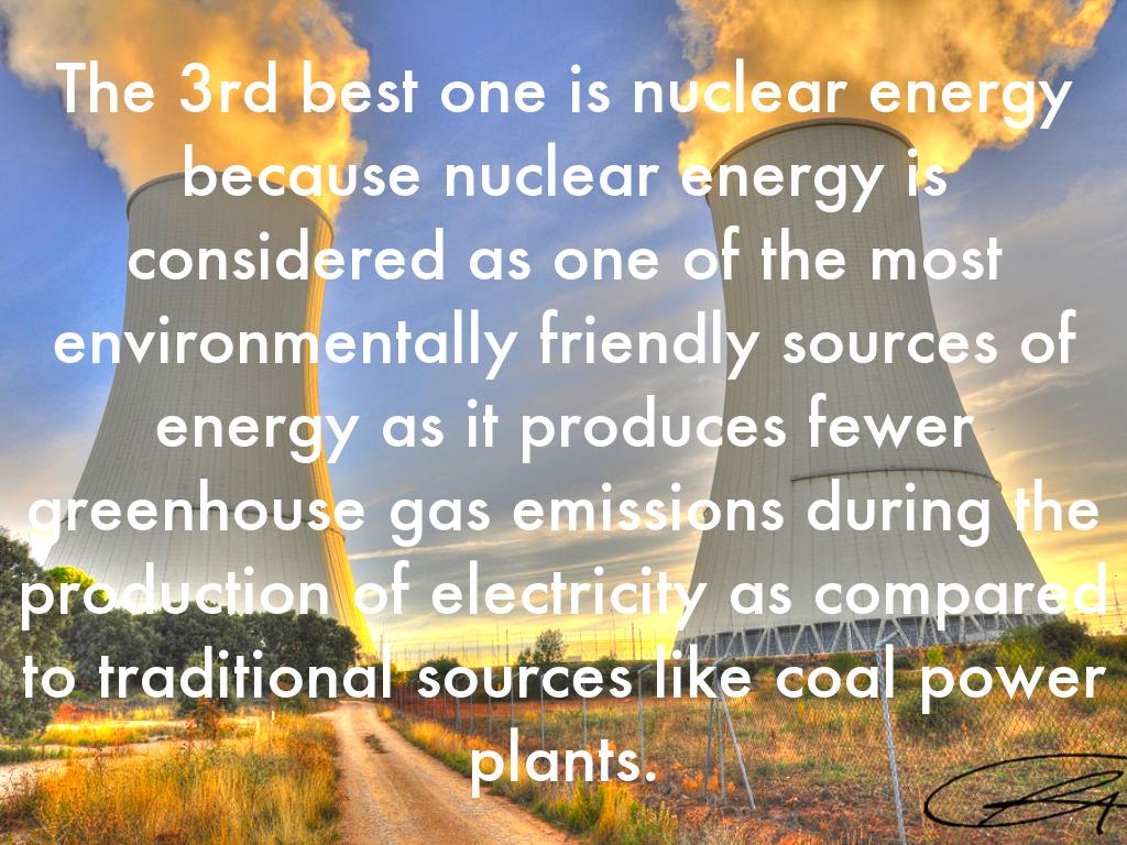 The 3rd best one is nuclear energy because nuclear energy is considered as one of the most environmentally friendly sources of energy as it produces fewer greenhouse gas emissions during the production of electricity as compared to traditional sources like coal power plants.