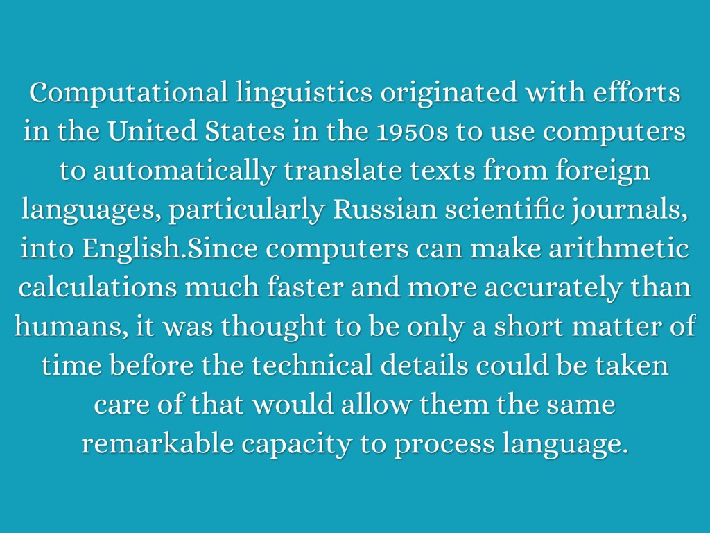Computational linguistics originated with efforts in the United States in the 1950s to use computers to automatically translate texts from foreign languages, particularly Russian scientific journals, into English.Since computers can make arithmetic calculations much faster and more accurately than humans, it was thought to be only a short matter of time before the technical details could be taken care of that would allow them the same remarkable capacity to process language.