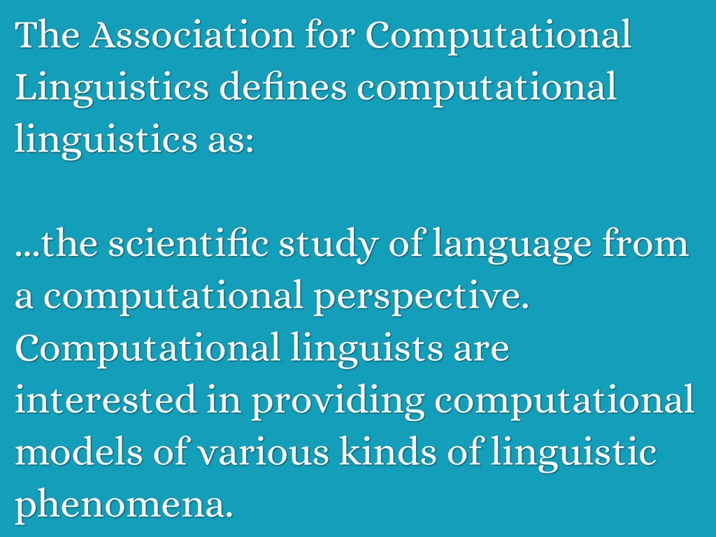 ...the scientific study of language from a computational perspective. Computational linguists are interested in providing computational models of various kinds of linguistic phenomena.