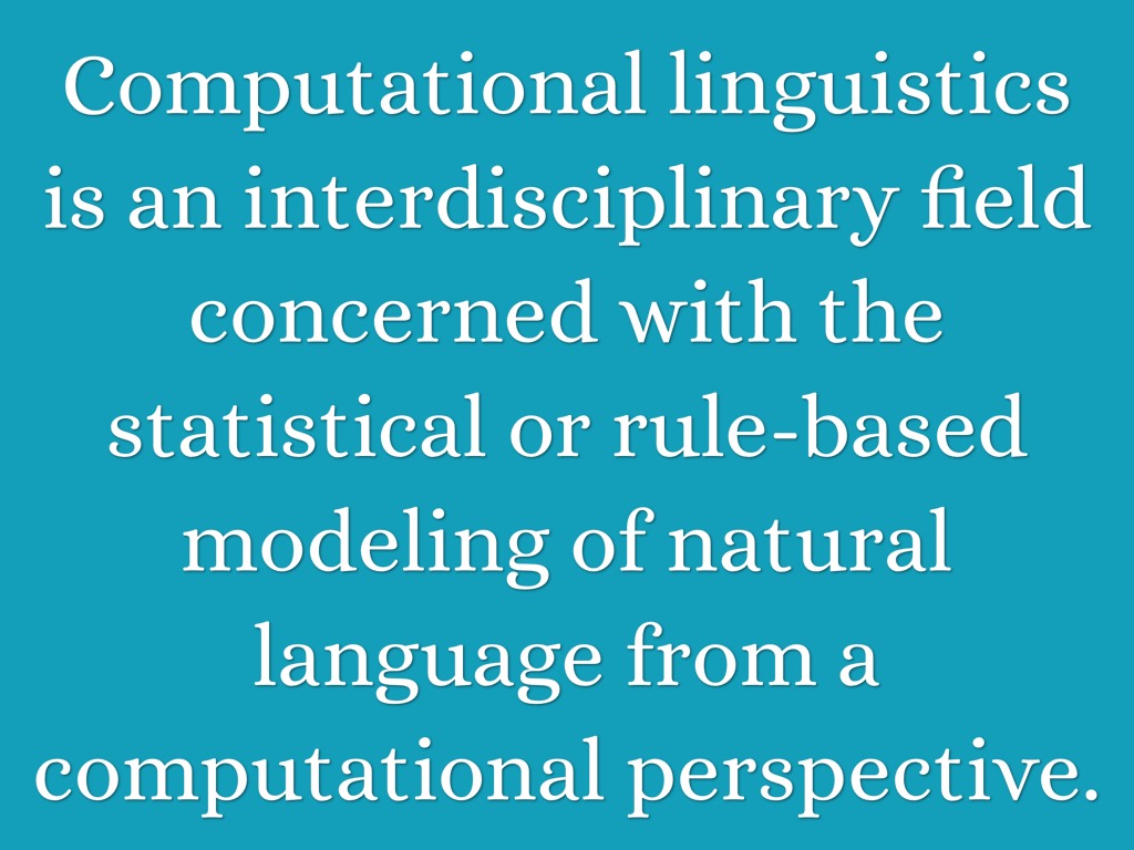 Computational linguistics is an interdisciplinary field concerned with the statistical or rule-based modeling of natural language from a computational perspective.