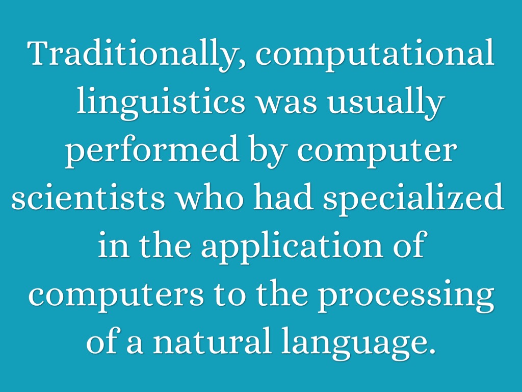 Traditionally, computational linguistics was usually performed by computer scientists who had specialized in the application of computers to the processing of a natural language.