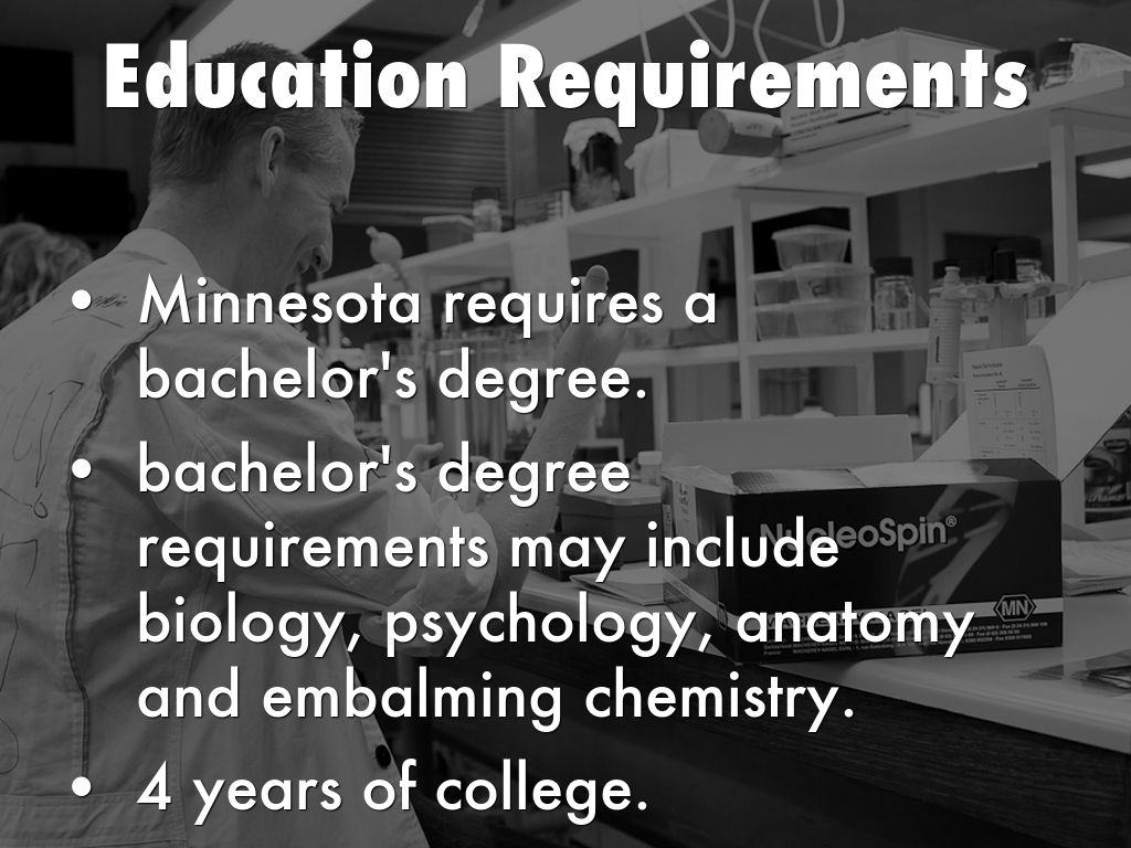 bachelor's degree requirements may include biology, psychology, anatomy and embalming chemistry.