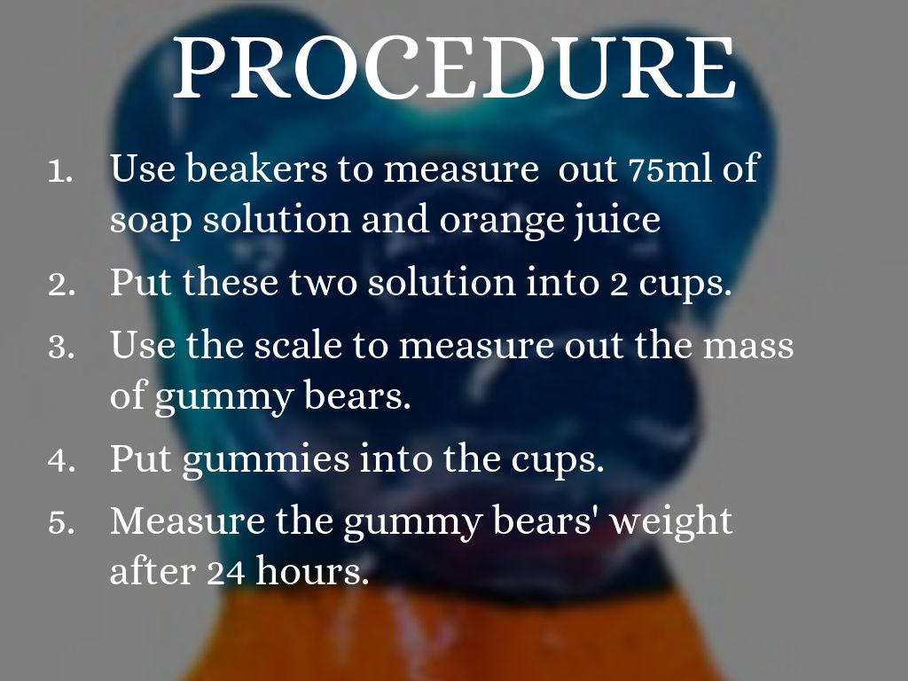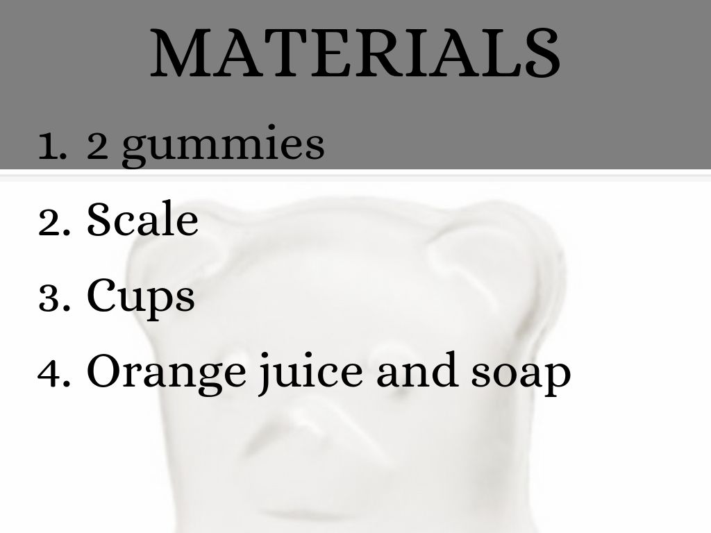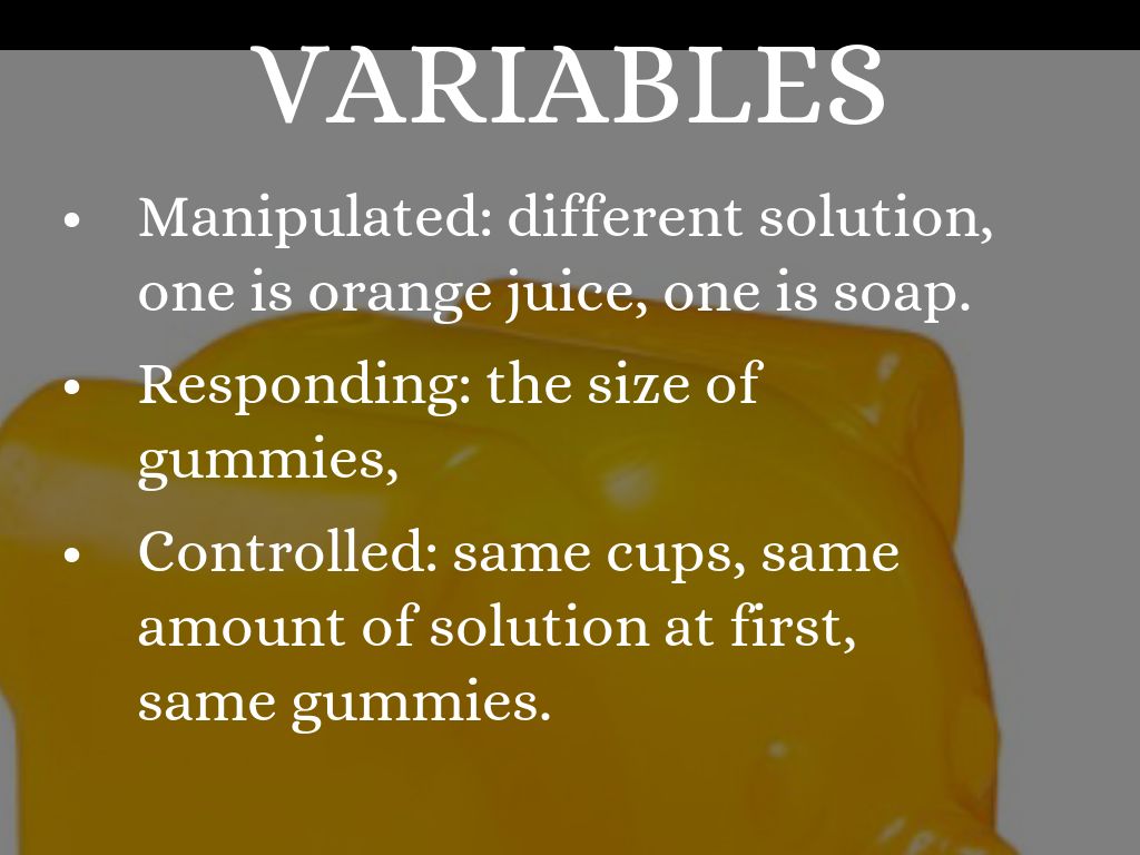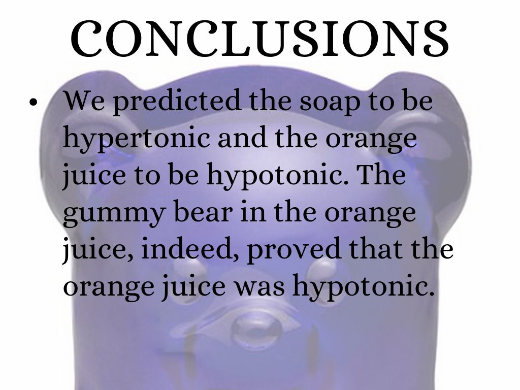 We predicted the soap to be hypertonic and the orange juice to be hypotonic. The gummy bear in the orange juice, indeed, proved that the orange juice was hypotonic.