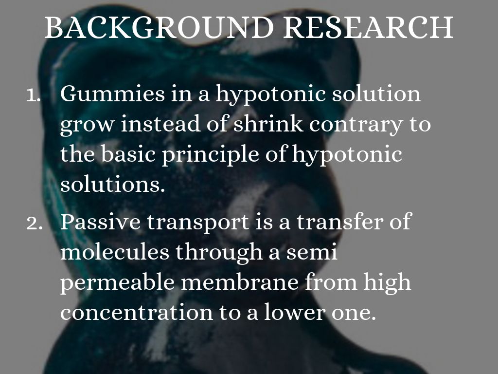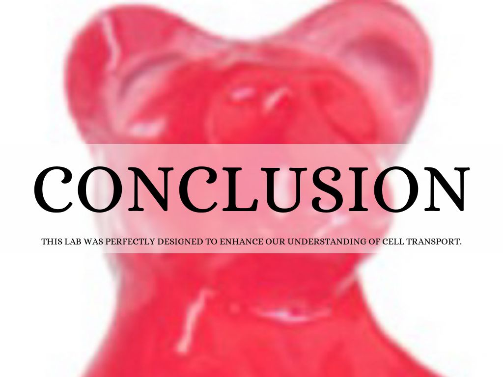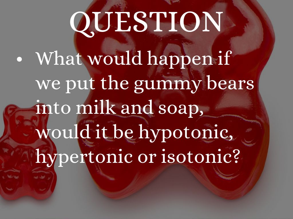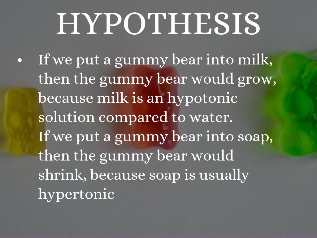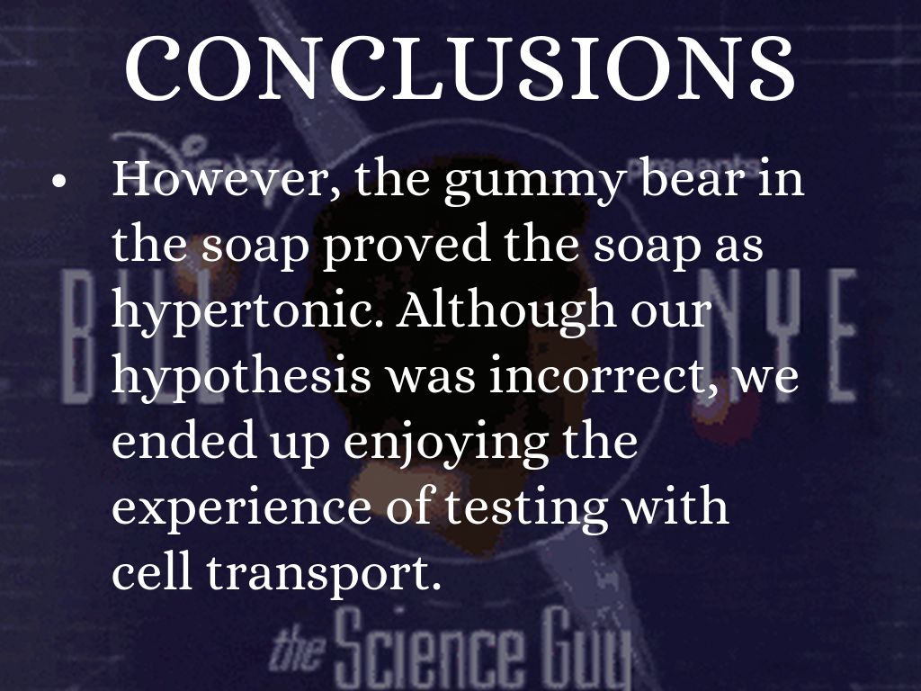 However, the gummy bear in the soap proved the soap as hypertonic. Although our hypothesis was incorrect, we ended up enjoying the experience of testing with cell transport.