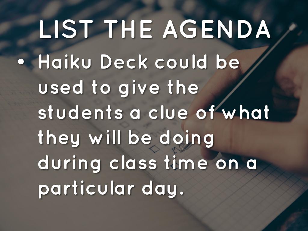 Haiku Deck could be used to give the students a clue of what they will be doing during class time on a particular day.