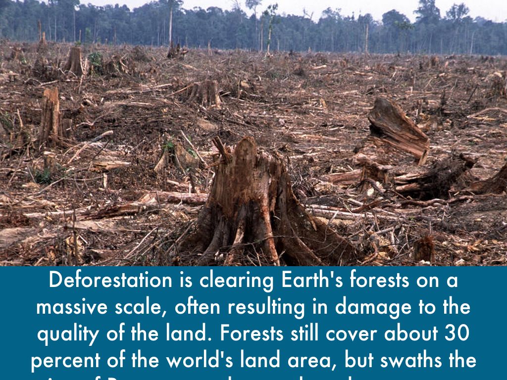 Deforestation is clearing Earth's forests on a massive scale, often resulting in damage to the quality of the land. Forests still cover about 30 percent of the world's land area, but swaths the size of Panama are lost each and every year.