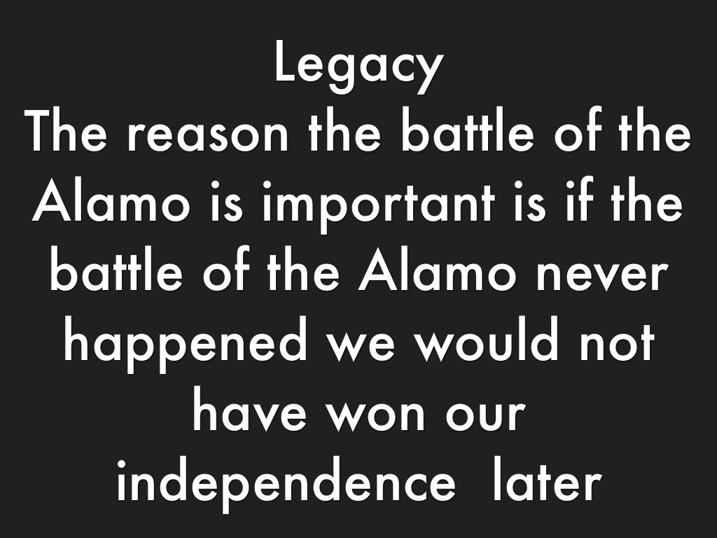 The reason the battle of the Alamo is important is if the battle of the Alamo never happened we would not have won our independence later.