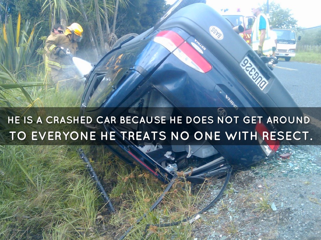 HE IS A CRASHED CAR BECAUSE HE DOES NOT GET AROUND