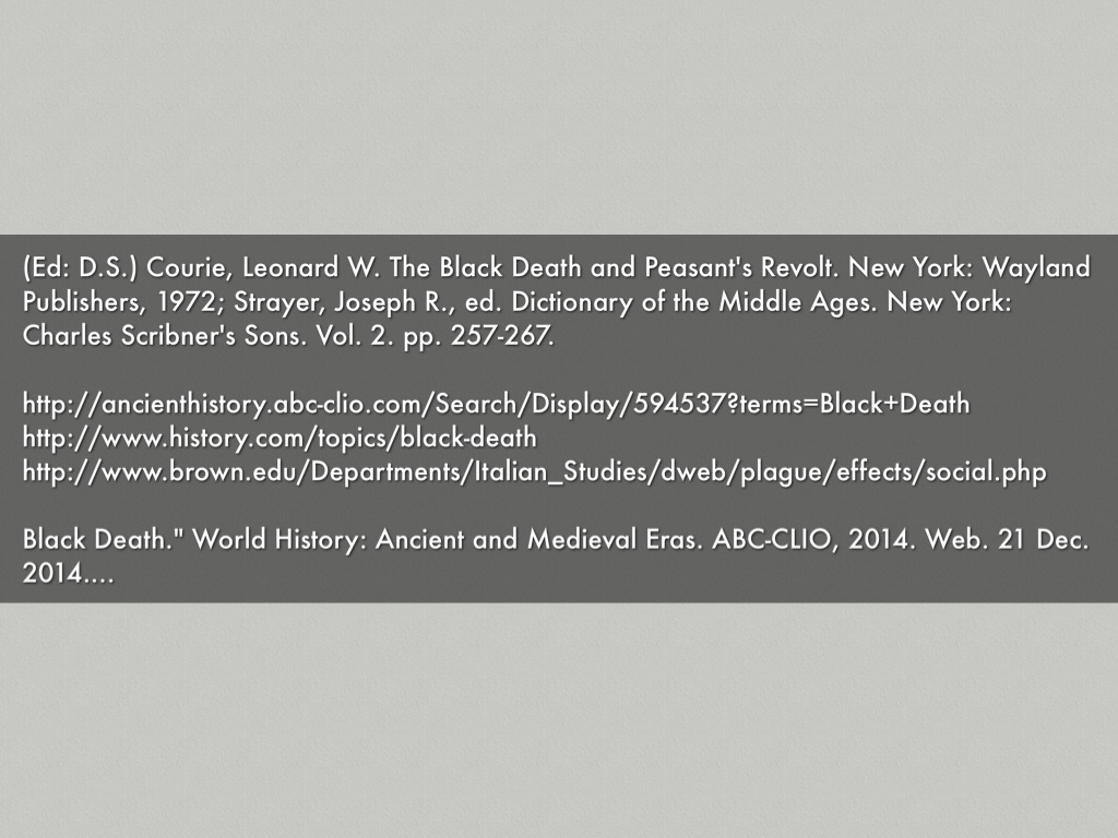 "Black Death." World History: Ancient and Medieval Eras. ABC-CLIO, 2014. Web. 21 Dec. 2014.