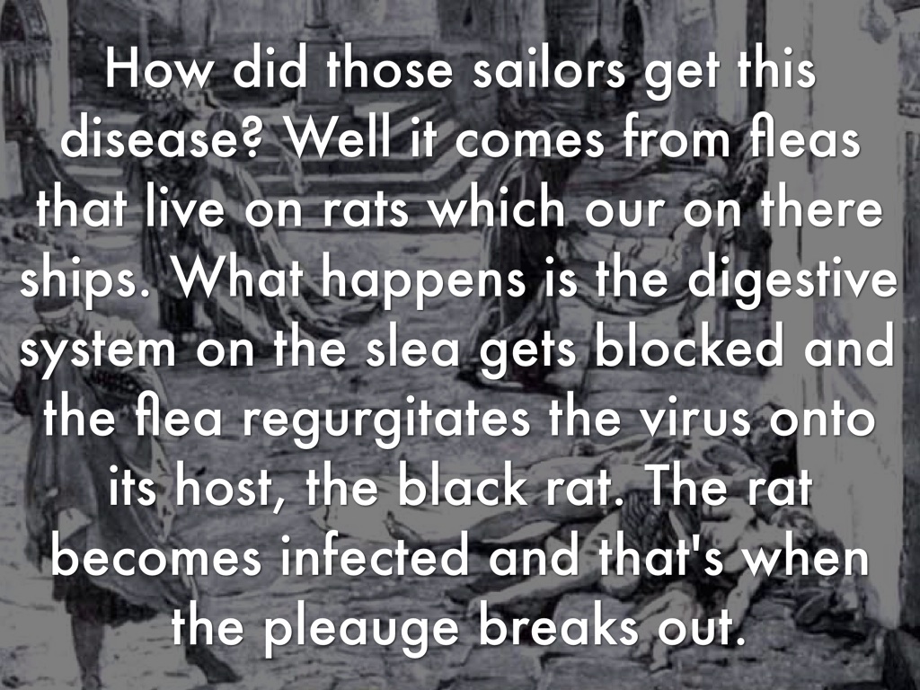 How did those sailors get this disease? Well it comes from fleas that live on rats which our on there ships. What happens is the digestive system on the slea gets blocked and the flea regurgitates the virus onto its host, the black rat. The rat becomes infected and that's when the pleauge breaks out.