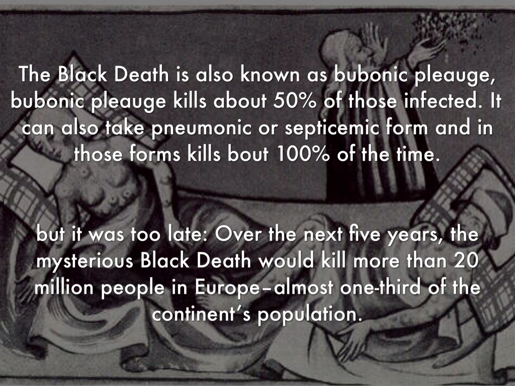 The Black Death is also known as bubonic pleauge, bubonic pleauge kills about 50% of those infected. It can also take pneumonic or septicemic form and in those forms kills bout 100% of the time.