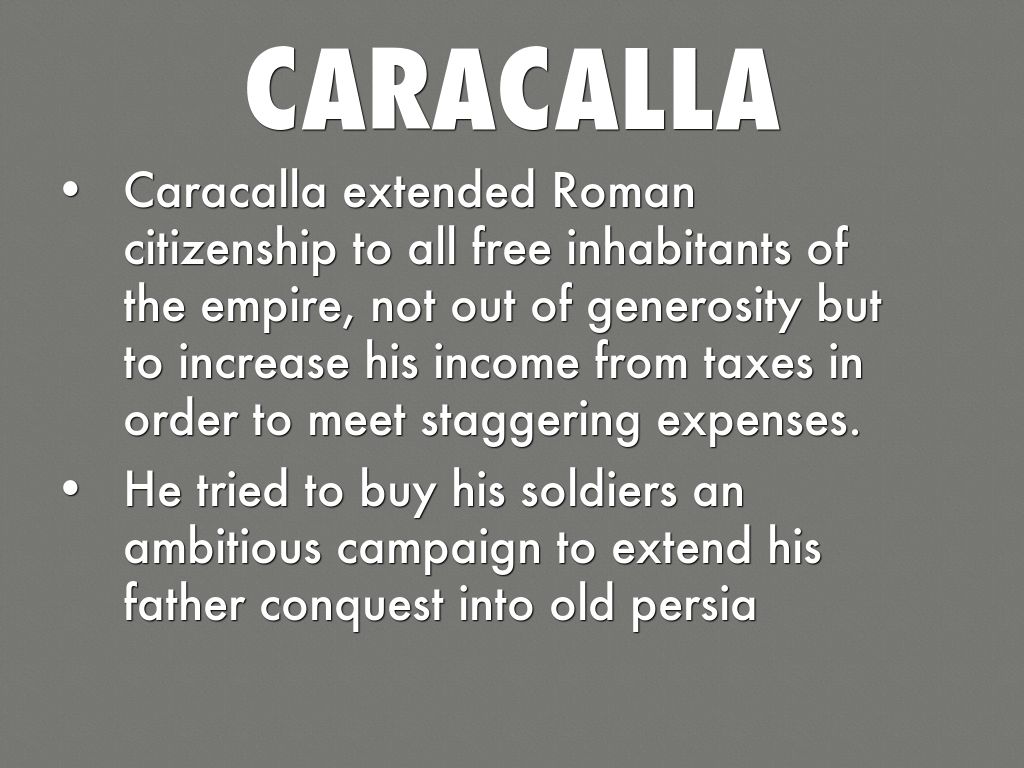 Caracalla extended Roman citizenship to all free inhabitants of the empire, not out of generosity but to increase his income from taxes in order to meet staggering expenses.