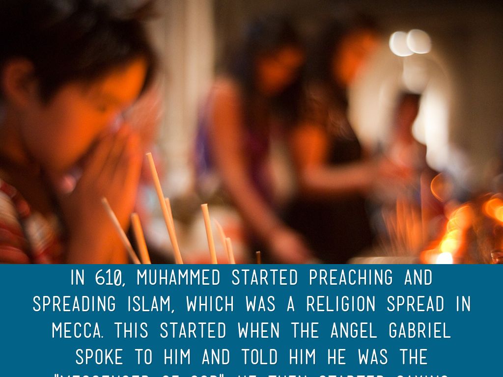 In 610, Muhammed started preaching and spreading Islam, which was a religion spread in Mecca. This started when the Angel Gabriel spoke to him and told him he was the "Messenger of God". He then started saying there was only one God. This went around and he then started preaching.