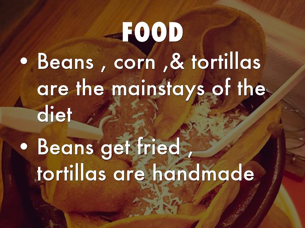 - Beans , corn ,& tortillas are the mainstays of the diet