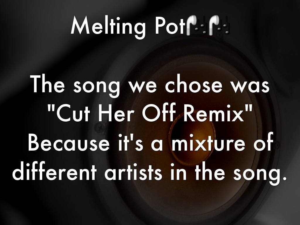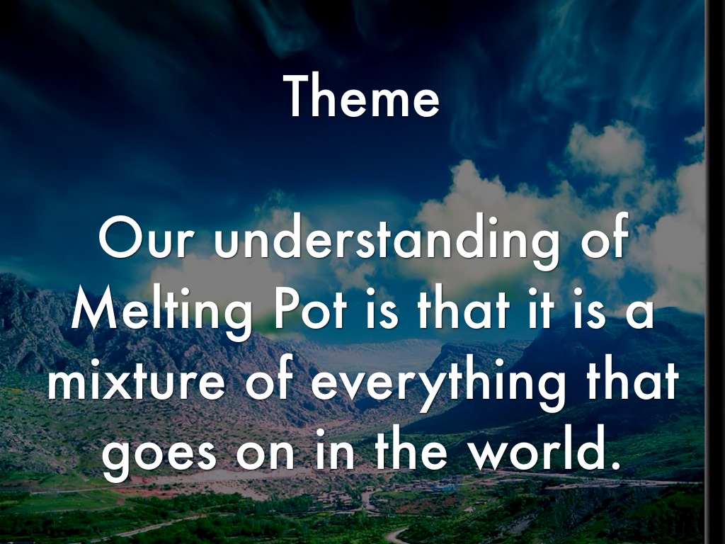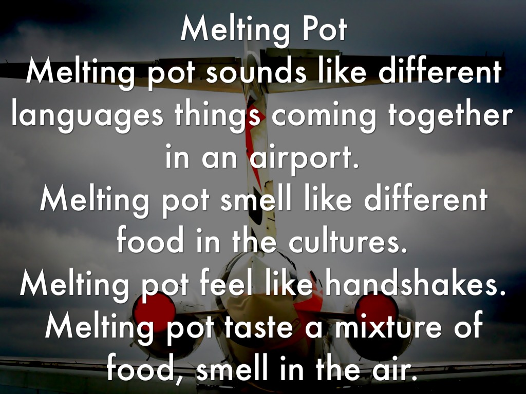 Melting Pot Melting pot sounds like different languages things coming together in an airport. Melting pot smell like different food in the cultures. Melting pot feel like handshakes. Melting pot taste a mixture of food, smell in the air.