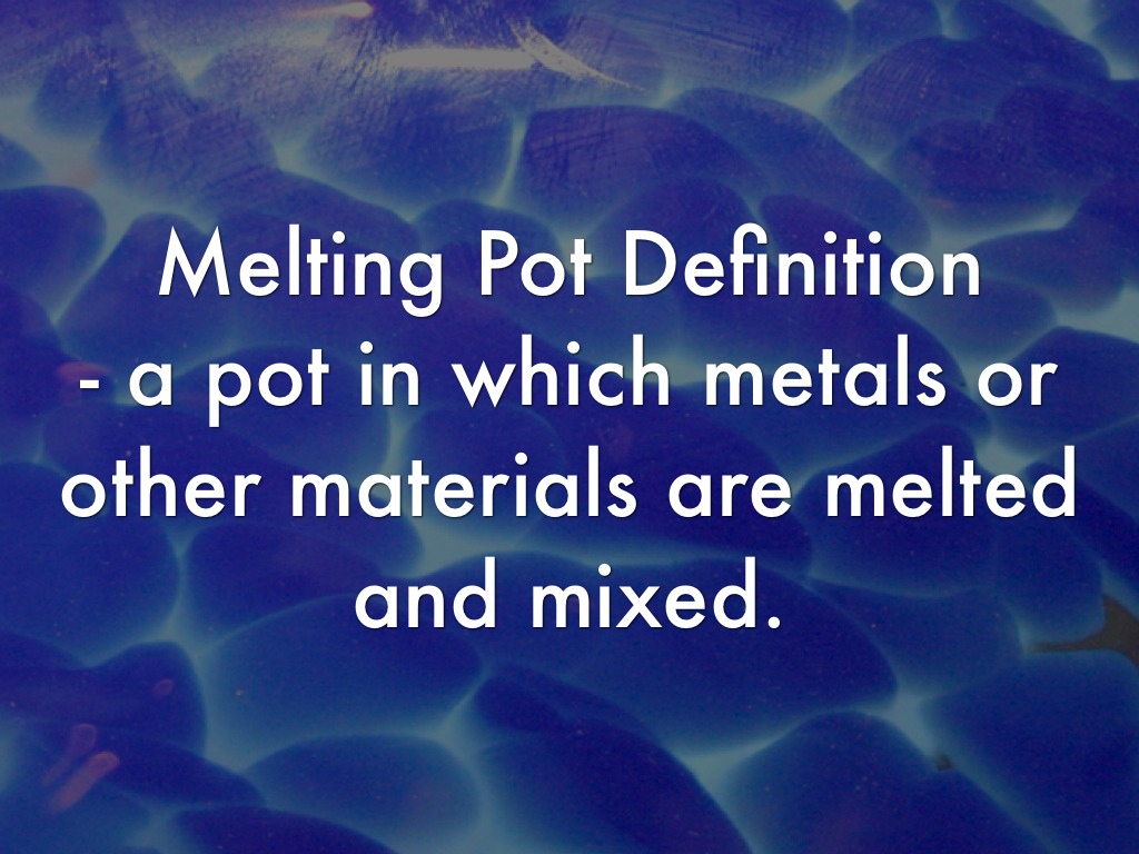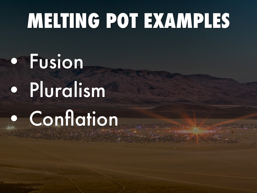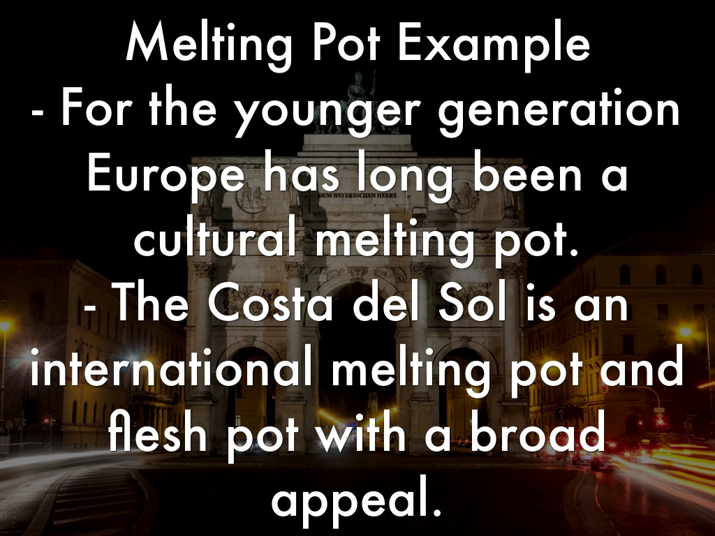 Melting Pot Example - For the younger generation Europe has long been a cultural melting pot. - The Costa del Sol is an international melting pot and flesh pot with a broad appeal.