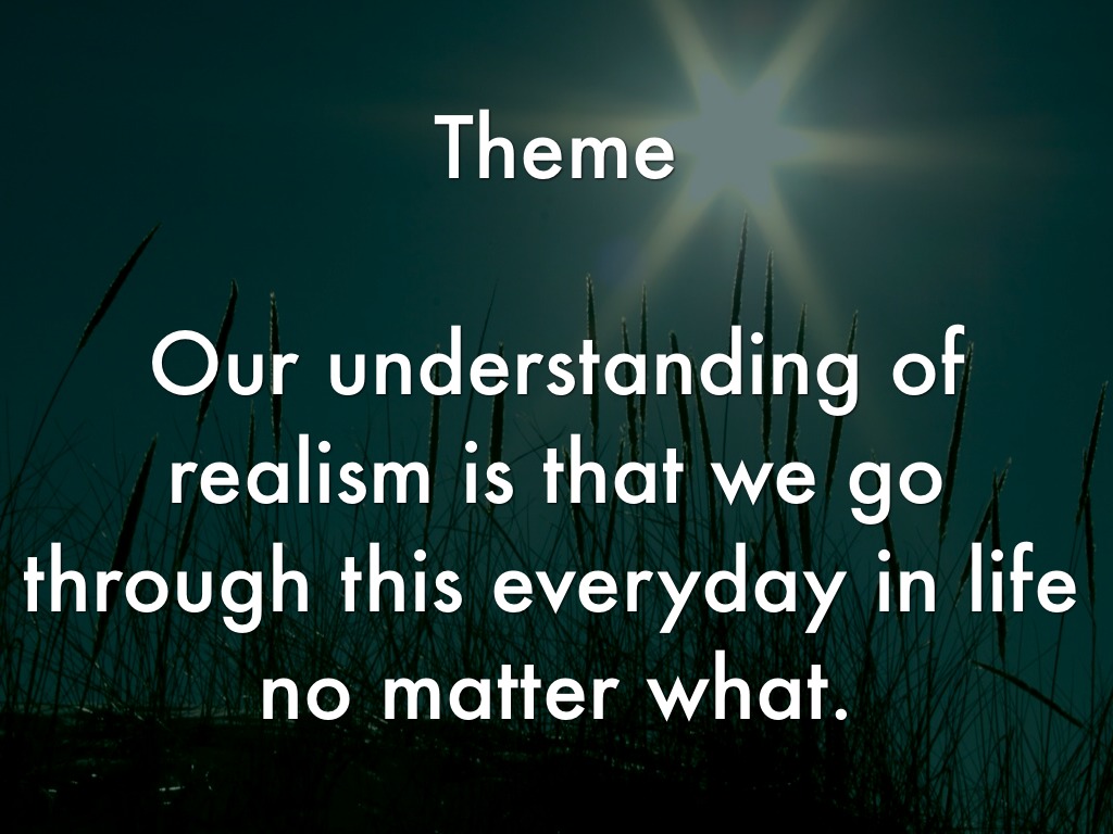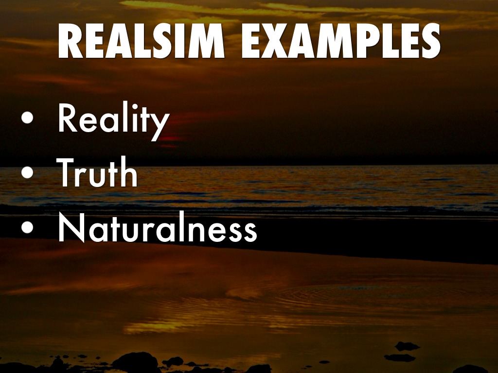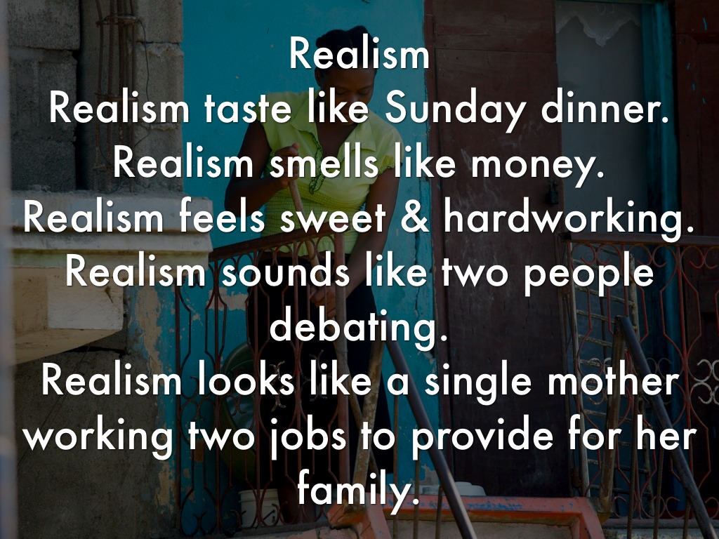Realism Realism taste like Sunday dinner. Realism smells like money. Realism feels sweet & hardworking. Realism sounds like two people debating. Realism looks like a single mother working two jobs to provide for her family.