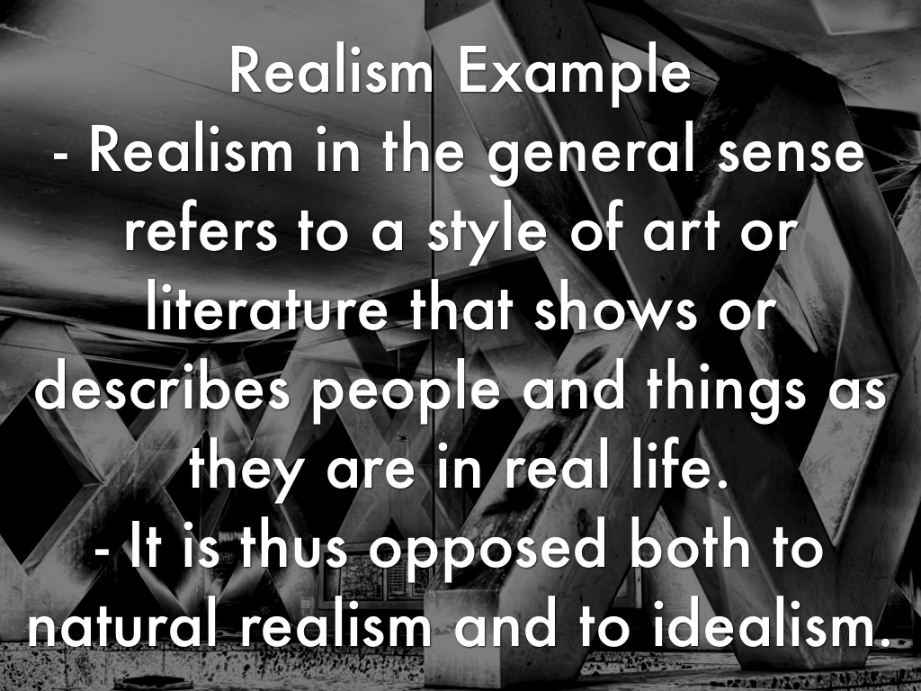 Realism Example - Realism in the general sense refers to a style of art or literature that shows or describes people and things as they are in real life. - It is thus opposed both to natural realism and to idealism.