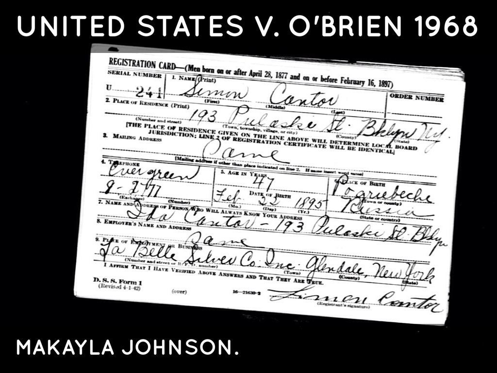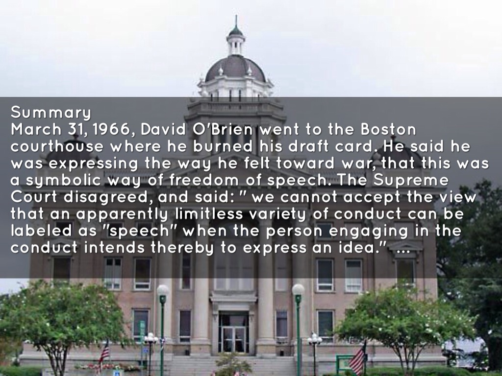March 31, 1966, David O'Brien went to the Boston courthouse where he burned his draft card. He said he was expressing the way he felt toward war, that this was a symbolic way of freedom of speech. The Supreme Court disagreed, and said: " we cannot accept the view that an apparently limitless variety of conduct can be labeled as "speech" when the person engaging in the conduct intends thereby to express an idea."