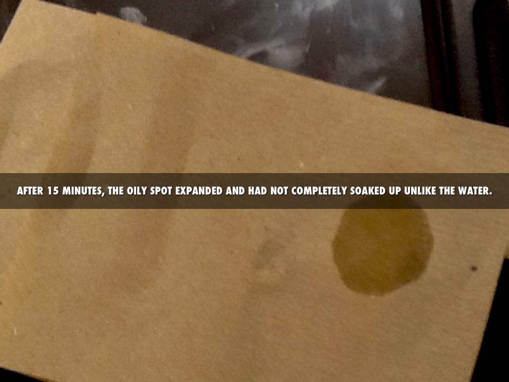 AFTER 15 MINUTES, THE OILY SPOT EXPANDED AND HAD NOT COMPLETELY SOAKED UP UNLIKE THE WATER.