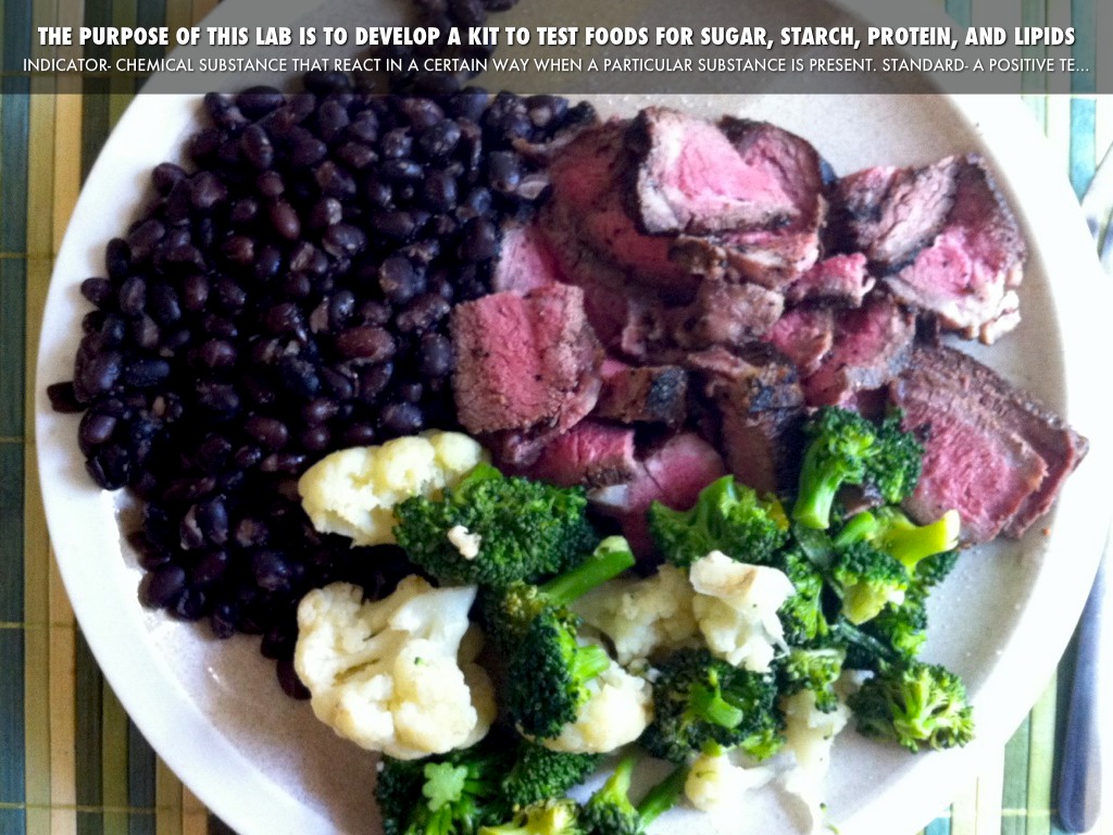 THE PURPOSE OF THIS LAB IS TO DEVELOP A KIT TO TEST FOODS FOR SUGAR, STARCH, PROTEIN, AND LIPIDS