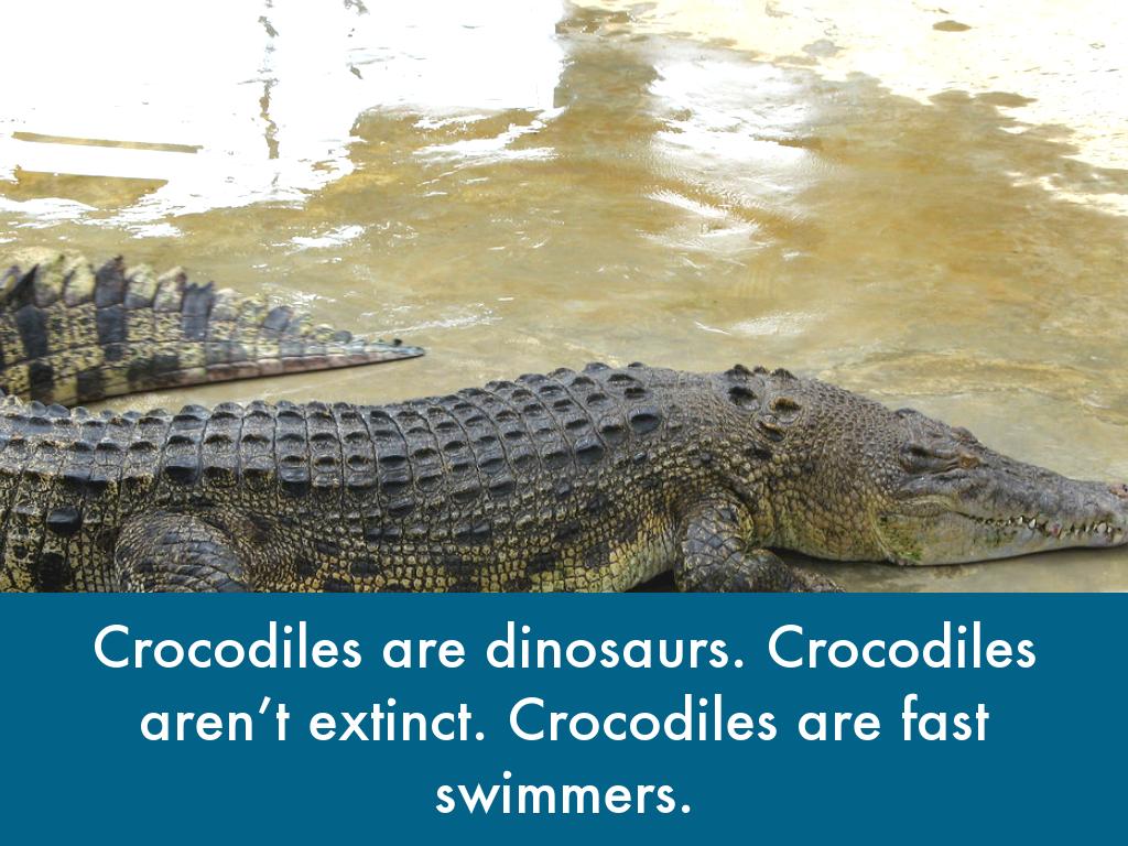 Crocodiles are dinosaurs. Crocodiles aren’t extinct. Crocodiles are fast swimmers.