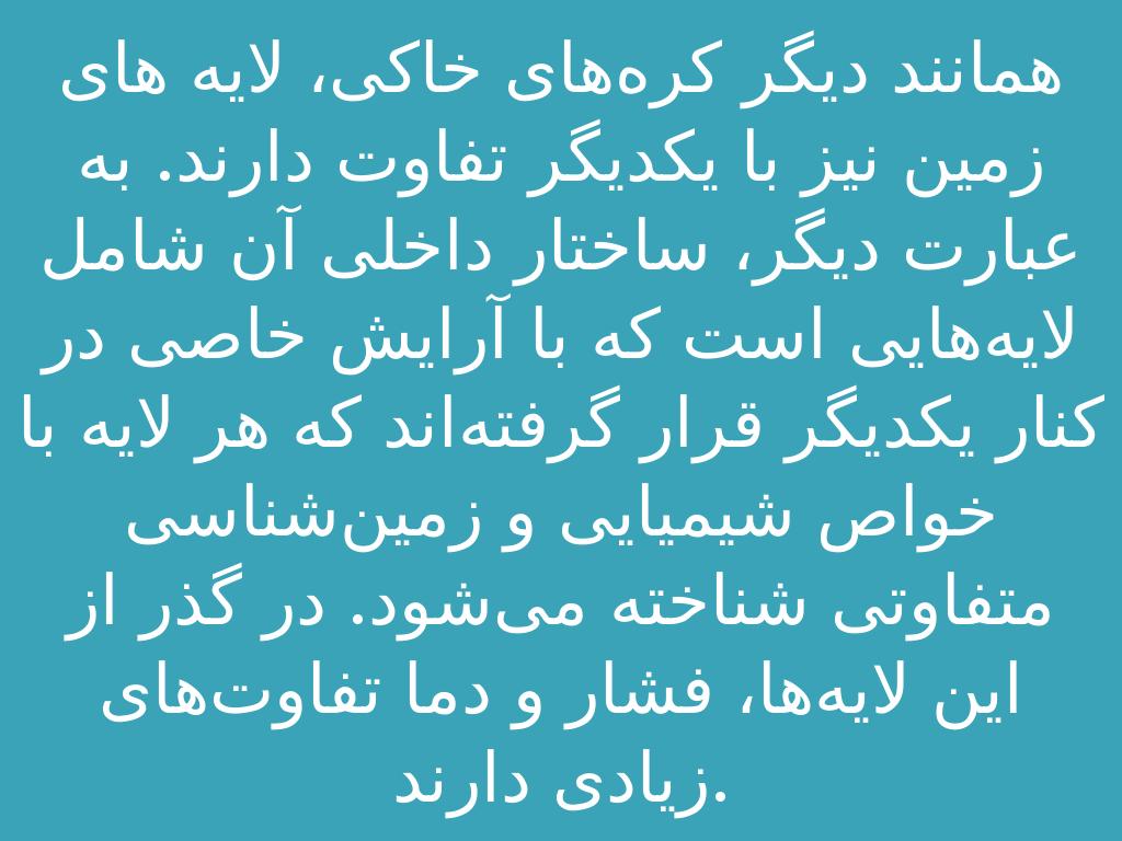 همانند دیگر کرههای خاکی، لایه های زمین نیز با یکدیگر تفاوت دارند. به عبارت دیگر، ساختار داخلی آن شامل لایههایی است که با آرایش خاصی در کنار یکدیگر قرار گرفتهاند که هر لایه با خواص شیمیایی و زمینشناسی متفاوتی شناخته میشود. در گذر از این لایهها، فشار و دما تفاوتهای زیادی دارند.