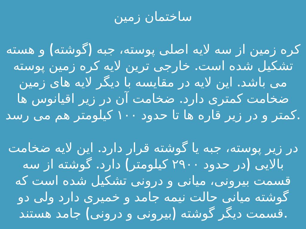 کره زمین از سه لایه اصلی پوسته، جبه (گوشته) و هسته تشکیل شده است. خارجی ترین لایه کره زمین پوسته می باشد. این لایه در مقایسه با دیگر لایه های زمین ضخامت کمتری دارد. ضخامت آن در زیر اقیانوس ها کمتر و در زیر قاره ها تا حدود ۱۰۰ کیلومتر هم می رسد.